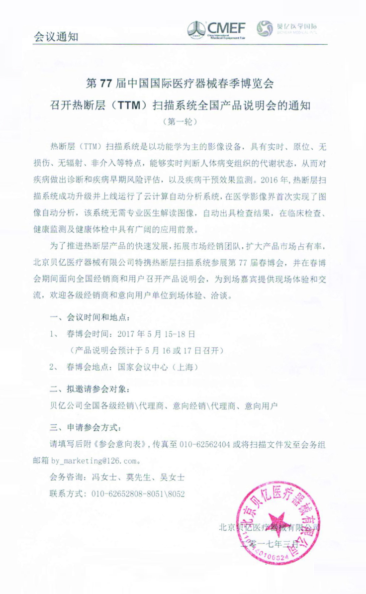 關(guān)于第77屆中國(guó)國(guó)際醫(yī)療器械博覽會(huì) 召開熱斷層(TTM)掃描系統(tǒng)全國(guó)產(chǎn)品說(shuō)明會(huì)的通知 (第一輪)